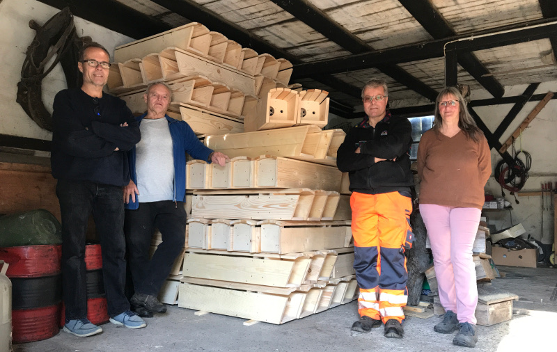 Es ist vollbracht: Der 2. Vorsitzende der FOGE, der Schreiner Lothar Grau (2. von rechts), hat in seiner Werkstatt in Horrheim insgesamt 121 neue Steinkauzröhren gezimmert. Die FOGE wird die Nisthilfen in den nächsten Jahren verwenden, um beschädigte Röhren auszutauschen und in geeigneten Habitaten neue Brutmöglichkeiten zu schaffen.