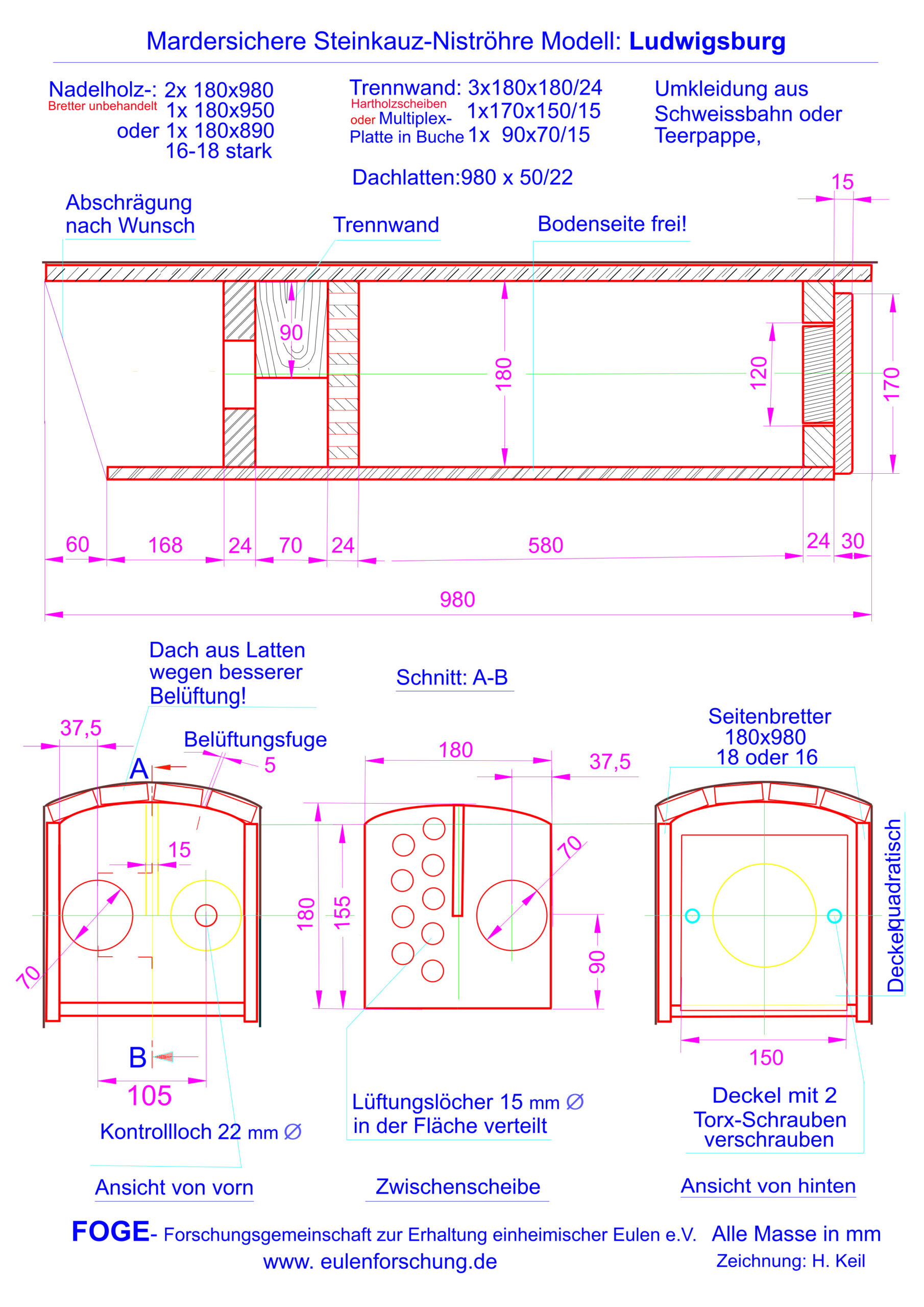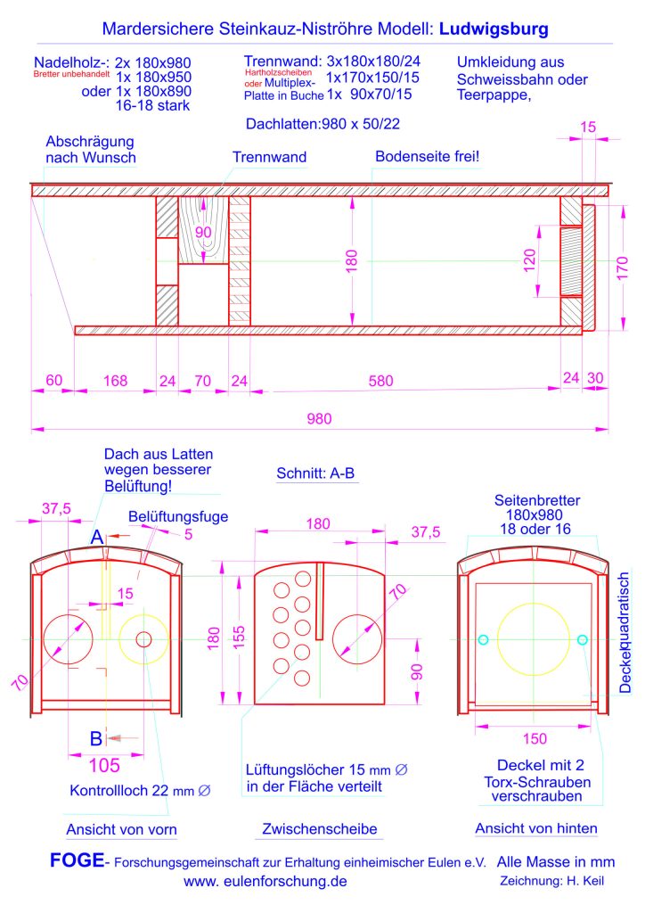 Wir haben durch praktische Erfahrungen sowie durch Foto- und Videoüberwachung einzelner Kästen Erkenntnisse gewonnen, mit deren Hilfe wir diese Art der Brutröhren noch weiter verbessern konnten: Da sich am Boden einer runden Röhre unter bestimmten Bedingungen Staunässe bilden und zu einem für die Jungvögel schädlichen Kloakenmilieu führen kann, haben unsere Nisthilfen einen geraden Boden. Hierdurch verteilt sich Feuchtigkeit gleichmäßiger im Substrat, was die Gefahr von Staunässe verringert. Der Dachbereich sollte unserer Erfahrung nach allerdings abgerundet sein: Oft picken Spechte bei der Nahrungssuche Löcher in die Dachpappe – bei einer geraden Oberfläche sammelt sich Wasser an diesen Stellen und dringt in den Kasten ein. Bei einem nach oben abgerundeten Dach fließt der Regen direkt außen ab und dringt nicht so schnell in Schwachstellen ein. Ein wichtiges Kriterium bei der Konstruktion von Steinkauzkästen ist der Schutz vor Prädatoren, besonders dem Steinmarder. Durch eine Zwischenwand im Eingangsbereich der Nisthilfe entsteht eine Engstelle, die es dem Marder erschwert, in den Kasten einzudringen. Der Nachteil ist, dass Niströhren ohne Marderschutz vom Steinkauz bereitwilliger angenommen werden als die geschützten Röhren. Und selbst eine Mardersicherung bringt keinen hundertprozentigen Schutz, da besonders schlanke Tiere dennoch ins Innere des Kastens gelangen. Trotzdem überwiegt laut unserer Erkenntnisse der Nutzen des Marderschutzes seine Nachteile – zumindest in unserer Region mit einer offenbar hohen Dichte an Steinmardern. Eine gewissen weiteren Schutz bietet der überdachte Vorbau unserer Röhren. Dieser erschwert es Greifvögeln (z.B. Mäusebussard, Habicht), mit ihren Fängen in den Eingangsbereich der Höhle hineinzulangen und Jungvögel hinauszuzerren. Letztendlich ist festzuhalten, dass es auch und gerade unter natürlichen Bedingungen nicht die optimale Bruthöhle geben kann. Dennoch ist es unser Anliegen, einer bedrohten Art wie dem Steinkauz Nisthilfen anzubieten, welche einen möglichst hohen Bruterfolg begünstigen.