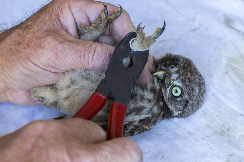 Eine der wichtigsten Methoden ist die wissenschaftliche Beringung von Jungvögeln. Dieses geschieht in enger Kooperation mit der Vogelwarte Radolfzell und selbstverständlich mit der notwendigen Genehmigung der Oberen Naturschutzbehörde im Regierungspräsidium Stuttgart. Wiederfunde der Ringe geben beispielsweise Rückschlüsse darauf, wie sich eine Population ausbreitet oder wie geografische Lücken zwischen bestehenden Restpopulationen geschlossen werden können. Zu Wiederfunden kommt es entweder beim zufälligen Fund toter Tiere oder beim gezielten Wiederfang von Altvögeln. Auch andere Eigenschaften wie Partner- oder Reviertreue oder auch maximale und durchschnittliche Lebensdauer von Steinkäuzen kann mit Hilfe von Ringfunden ermittelt werden. Die wissenschaftliche Beringung mit extrem leichten Aluminiumringen bedeutet für den Vogel bei sachgemäßer Anwendung keinerlei Beeinträchtigung. Das belegt nicht nur unsere über 30-jährige Arbeit sondern auch die Erfahrungen der Vogelwarte Radolfzell und anderer Beringungszentralen.