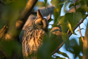 Die Waldohreule ist so groß wie die Schleiereule. Auffallend sind ihre langen, meist hochaufgerichteten Federohren und ihre feuergelben bis glutroten Augen. Das Gefieder ist oberseits gelblich-braun mit dunklen Schaftstrichen.